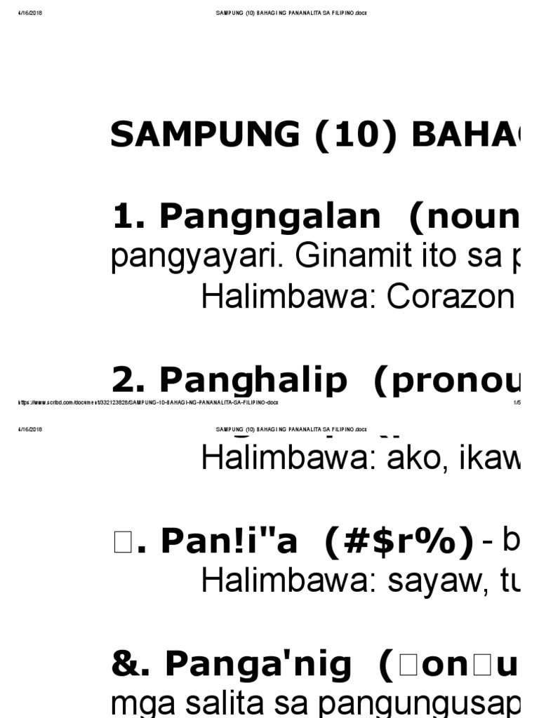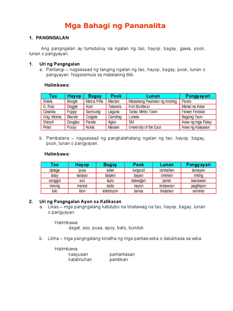 Some of the worksheets for this concept are filipino baitang 2 ikaapat na markahan, piliin ang titik ng pinakawastong, uri ng mga salita ayon sa kayarian, banghay aralin sa pagtuturo ng panimulang pagbasa para sa. Ang mga bahagi ng pananalita ay panngalan, panghalip, pandiwa, pangatnig. See more of bahagi ng pananalita on facebook. Mga pangalan ng tao, hayop, pook, bagay, pangyayari. Ang bahagi ng pananalita (part of speech)ay isang lingguwistikong kauriang panleksiko ng mga salita o bahaging panleksiko na pangkalahatang binibigyang kahulugan sa pamamagitan ng morpolohikong asal.